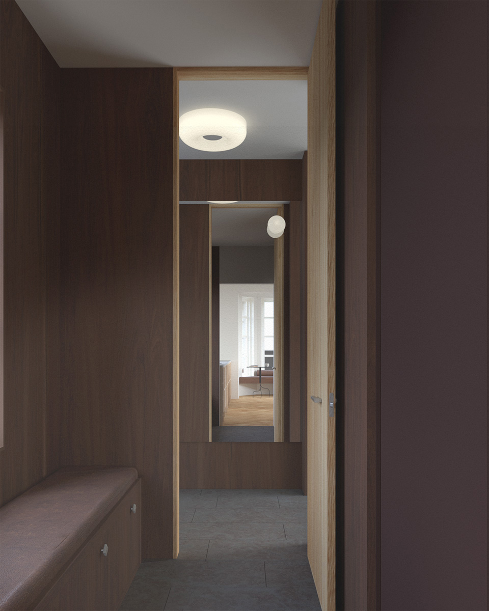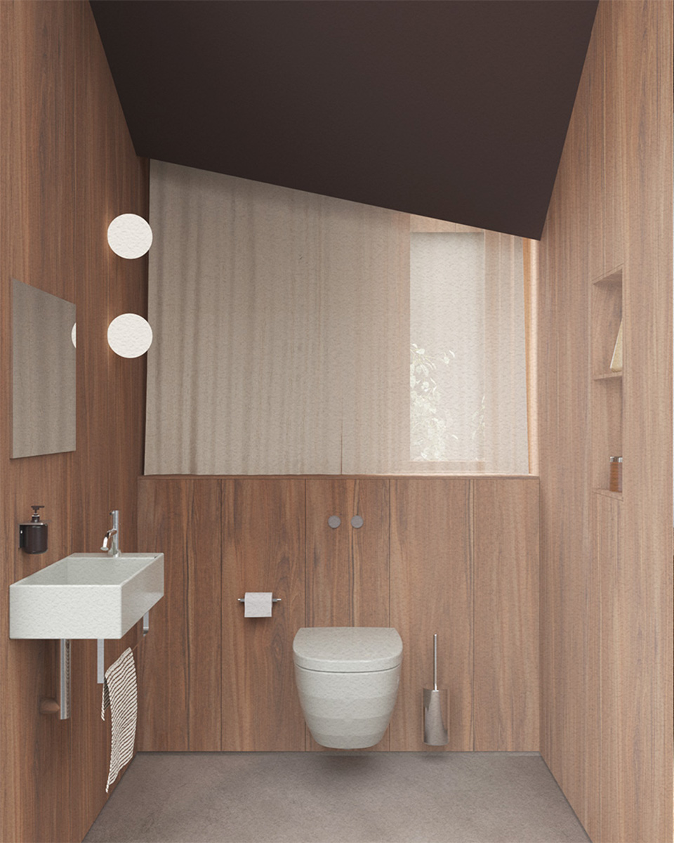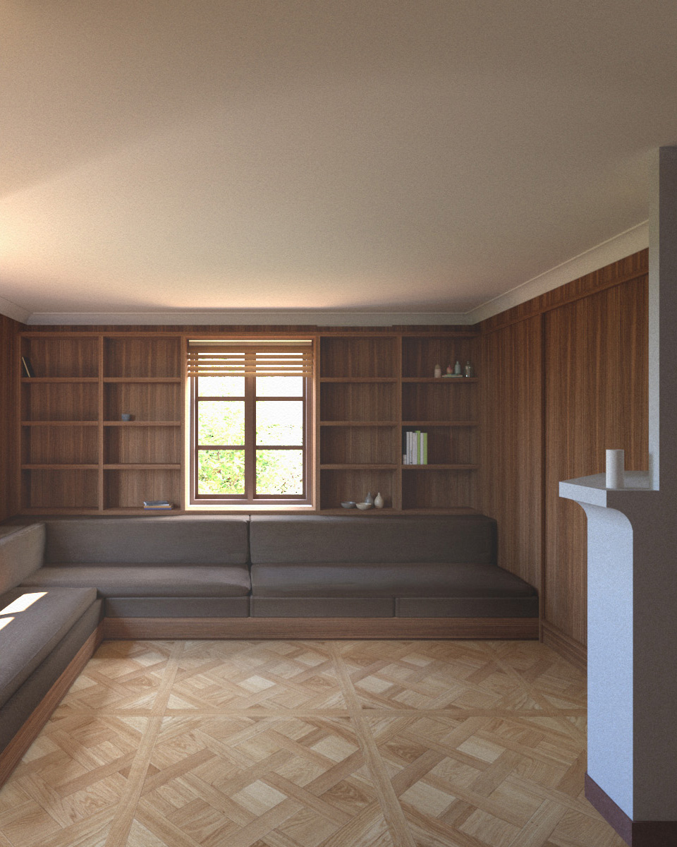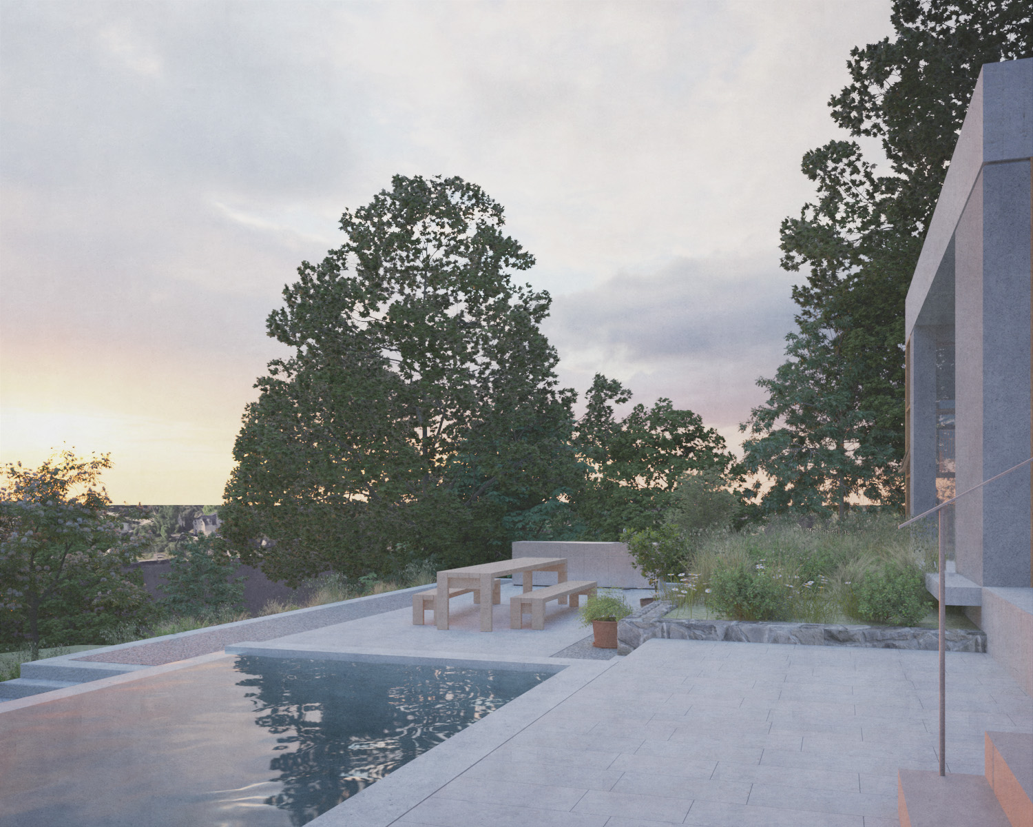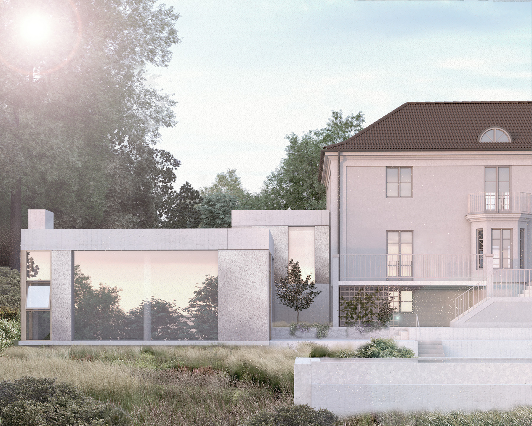Projektet innefattar restaurering av den befintliga byggnaden på platsen, tillbyggnad, poolhus och utemiljö. Tillbyggnaden utförs med väggar putsade i en ljusgrå ton och takavslut i slätgjuten betong. Putsens kulör går ton-i-ton med huvudbyggnaden, men med större gräng i ytbearbetningen. Tillbyggnadens stora fasta panoramafönster utförs med dolda karminfästningar för ett samtida uttryck. Öppningsbara fönster och fönsterdörrar görs hantverksmässigt i ek. Byggnadernas grund gjuts med platta på mark, en låg synlig betongsockel ger ett sammanhållet möte med marken. De naturliga materialen i en ljus kulörskala passar väl in i omgivningen som präglas av både modern och klassisk arkitektur. Detaljer kring fönsternischer samt möten mellan fönster, fasadmaterial och tak utförs med stor precision. I mötet mellan nytt och gammalt byggs en länkdel. Den placeras vid ett befintligt fönster på huvudbyggnadens västra fasad för att göra minimal åverkan på befintlig byggnad. Länken innehåller en trappa ned till den nya tillbyggnaden som placeras med fönster mot trädgården på dess södra sida. Poolhuset utförs likt huvudbyggnadens tillbyggnad, med väggar putsade i en ljusgrå ton och ett takavslut i slätgjuten betong, och knyter samman byggnadsgestalterna på södra sidan av tomten. Detaljering, materialitet och öppningar görs lika tillbyggnaden.